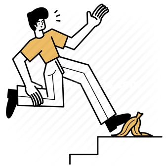 This illustration captures a humorous moment where an individual is depicted losing balance on a staircase due to a banana peel. The character's exaggerated expression and pose convey both surprise and impending misfortune. The drawing style is hand-drawn, emphasizing the cartoonish elements that enhance the comedic aspect of the scene. This artwork can be effectively utilized in social media campaigns, educational materials about safety, or comedic articles highlighting the importance of caution in everyday situations.