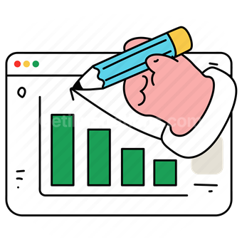 This illustration features a hand holding a pencil, actively drawing a bar graph on a digital screen. The bars are depicted in a vibrant green, symbolizing growth and data analytics. The overall composition reflects a modern, engaging style, suitable for websites and marketing materials related to business analytics, productivity tools, or educational content. The clean lines and simplistic design enhance its visual appeal, making it versatile for both online and offline applications, such as presentations and infographics. The drawing style, characterized by bold outlines and clear colors, effectively communicates concepts of improvement and progress.